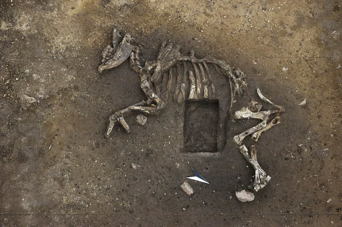 Da die Steinkiste in den humosen Oberboden gesetzt war, sollte geklärt werden, ob die Kiste ursprünglich Bestandteil einer größeren Grabgrube war. Bei diesem Arbeitsschritt zeigten sich nördlich und südlich der Steinkiste tierische Knochen (Abbildung 2). Bald stellte sich heraus, dass sie zu einem vollständigen Rinderskelett gehören. Trotz der schlechten Knochenerhaltung deuten die relativ schlanken Extremitäten-Knochen auf ein weibliches Tier, und zwar im Alter zwischen vier und fünf Jahren. Es lag auf der rechten Körperseite, der Kopf wies in Richtung Süden. Die Vorderbeine waren stark, die Hinterbeine leicht gewinkelt, wobei der linke Lauf jeweils auf dem rechten lag.