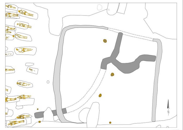 Interessanterweise befinden sich hier zwei tiefe Pfostengruben außerhalb des Kirchengrundrisses, die den Gang flankieren (Abbildung 7). Weiter westlich ist der Gang nicht mehr nachweisbar. Allerdings beginnt etwa einen Meter westlich der Pfostenstellung die Belegung des Gräberfeldes und ein weiterer Verlauf ist nicht mehr denkbar, sodass eine Art Zugang vermutet werden darf, oder aber der Gang hier blind endet.