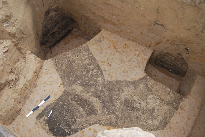 Im Binnenbereich der Kirche konnte ein Befund erfasst werden, der in Mitteldeutschland zu den absoluten Raritäten gehört. Bei der Untersuchung einiger unscheinbarer isolierter Einzelbefunde stellte sich heraus, dass diese im Untergrund miteinander verbunden waren. Hierbei handelt es sich um einen sogenannten Erdstall, ein Kriechgangsystem. Von diesem konnten nur einige Abschnitte erfasst werden, da größere Bereiche mit Lößversturz verfüllt und im anstehenden Löß unkenntlich sind. Lediglich die Bereiche im Umfeld der Zugänge sind mit humosem Substrat verfüllt und damit archäologisch fassbar (Abbildung 5). Das Gangprofil weist einen spitzbogigen Querschnitt mit ebener oder leicht gewölbter Sohle auf.