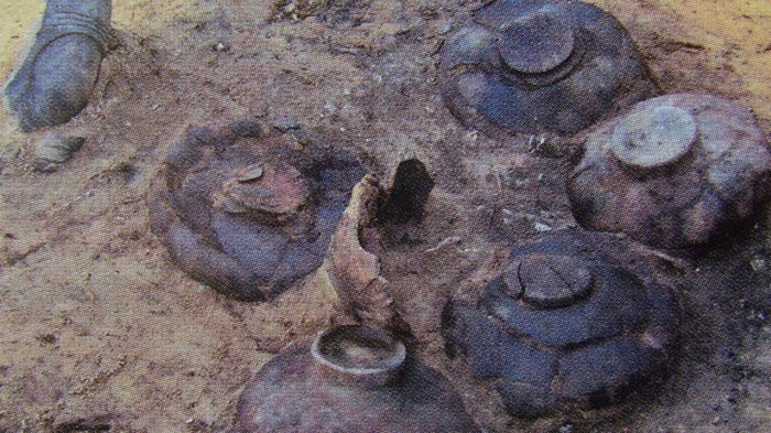 Die niedergelegten Gefäße präsentieren offensichtlich Formen, die überwiegend im Siedlungsgeschehen Verwendung fanden und selten in Gräbern beigegeben worden sind. Daher ist ihre zeitliche Einordnung problematisch. Es handelt sich durchweg um relativ grob gefertigte, flau profilierte Gefäße mit deutlich erkennbaren Knetspuren beziehungsweise unruhig verlaufender Oberfläche (Abbildungen 4 und 5). Es sind eine große Schüssel (Nummer 6), zwei eiförmige, geschlickte Töpfe mit Knubben (Nummer 5 und 7), ein flacher Topf (Nummer 2), fünf Schalen (Nummer 3, 8, 9, 11 und 13), eine Kanne (Nummer 1) und zwei Tassen (Nummer 4 und 12). Bei den Schalen lassen sich gegliederte Varianten, einmal mit drei Dellen auf der Schulter (Nummer 8 und 11), und einfache, flach gewölbte Exemplare (Nummer 3, 9 und 13) unterscheiden. Die eiförmigen Töpfe und die Kanne sind Formen, die bereits in der ausgehenden Bronzezeit auftreten, so jedoch auch später noch hergestellt worden sind. Auf eine etwas spätere Einordnung deuten insbesondere die Form der Henkel und die Profilierung der anderen Gefäße, so dass von einer Zugehörigkeit des gesamten Befundes in die frühe Eisenzeit (circa 8. Jahrhundert vor Christus) ausgegangen werden darf. Die Deponierung ist somit mit der Hausurnenkultur zu verbinden. Die für diese Kultur Namen gebenden Hausurnen – keramische Gefäße in Form von Wohnhäusern und Speicherbauten – sind in Europa in höherer Anzahl nur aus Mittel- und Norditalien, aus einem kleinen Teil des nördlichen Mitteldeutschlands zwischen Magdeburg und Halle sowie aus Norddeutschland und Skandinavien bekannt. Bis heute ist die Art der Verbindungen zwischen diesen ganz unterschiedlichen Gebieten nicht geklärt.