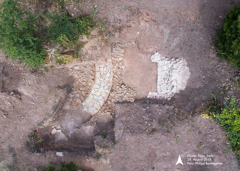 In diesem Zusammenhang stellte es eine glückliche Fügung dar, dass der gegenwärtig auf Posa tätige Verein »Kultur - und Bildungsstätte Kloster Posa e.V.« einen kleinen Teich sanieren möchte, der vor einigen Jahren hier ohne archäologische Begleitung angelegt worden war. Die Arbeiten zur Erkundung und Dokumentation des Teichgrundes begannen bereits im Jahre 2017 und werden gänzlich ehrenamtlich durchgeführt. Die Ergebnisse dieser Arbeiten bereichern unser Wissen über das Kloster und vor allem über die noch weiter zurückliegende Vergangenheit des Berges erheblich und sollen folgend kurz vorgestellt werden (Abbildung 4).