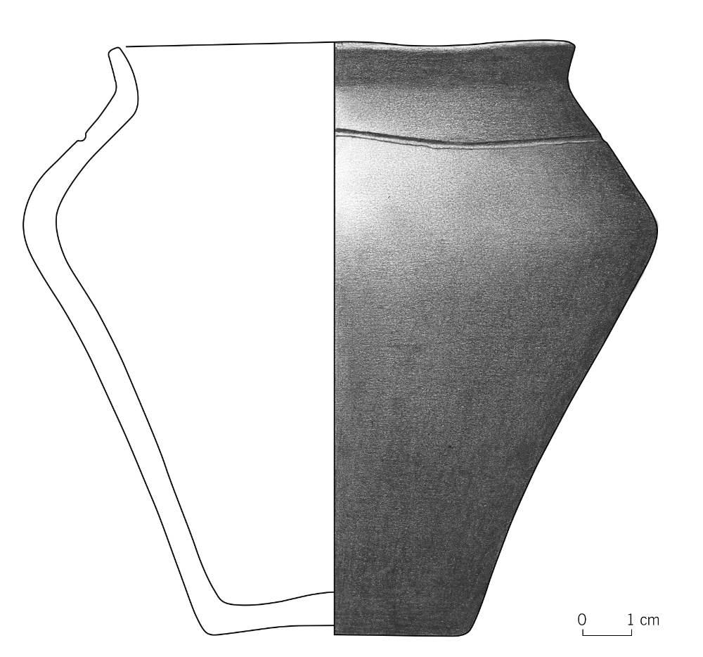 Es handelt sich um einen weitgehend vollständigen kleinen Topf von 11,9 Zentimeter Höhe, 9,4 Zentimeter Rand- und 5,3 Zentimeter Bodendurchmesser (Abbildungen 1 und 2). Er ist hochschultrig, der Umbruch (etwas variierend) recht scharf bis bauchig ausgeprägt, der ausgebogene Rand kantig facettiert. Das Gefäßunterteil ist konkav eingezogen, so dass die Gestalt insgesamt einer Situla ähnelt. Einziger Dekor ist eine um das Gefäß laufende Rille auf der Schulter. Das Behältnis ist unregelmäßig braungrau gebrannt, wobei sich bei der fleckigen Färbung auch sekundäre Einflüsse bemerkbar machen; an einigen Partien haftet feines braun-lehmiges Substrat als Zeugnis der fast zweitausendjährigen Bodenlagerung.