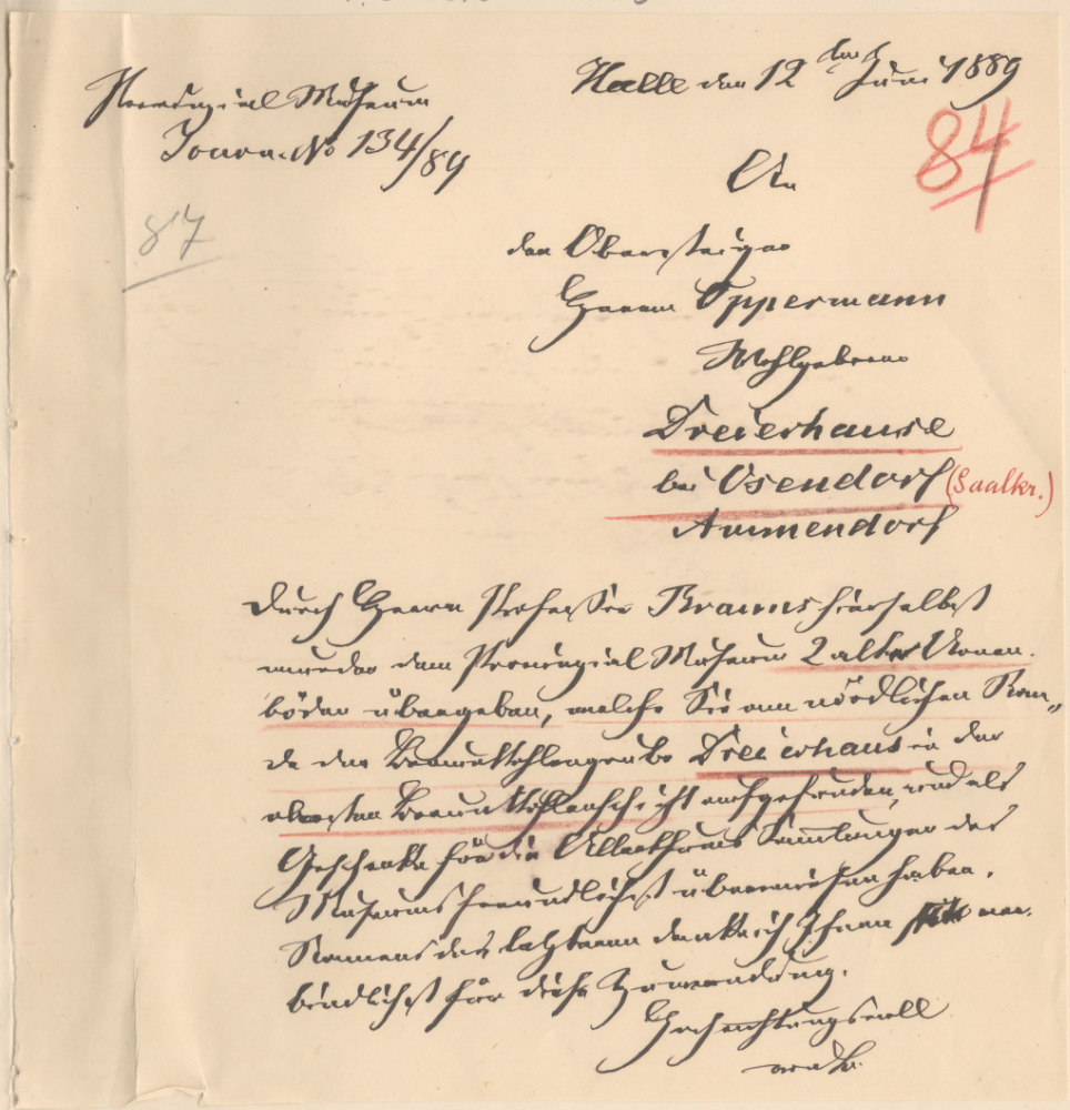 Wohl auch, weil sich das Tagebaufeld nordöstlich Osendorfs sehr dynamisch veränderte und verschiedene ursprünglich eigenständige Gruben vereinte, blieb die Bezeichnung ›am Dreierhaus‹ auch noch im frühen 20. Jahrhundert als Sammelbegriff üblich – 1905 etwa gelangte das ›Braunkohlenwerk Dreierhaus‹ an den hallischen Fabrikanten F. Krocket, und noch 1926 gab es dort eine so benannte Braunkohle-Gewerkschaft. Insbesondere im späten 19. Jahrhundert firmierte wenigstens ein Tagebau hier auch als ›Dreierhaus‹, wie ein Dankesschreiben von 1889 in den Ortsakten des Landesamtes für Denkmalpflege und Archäologie Sachsen-Anhalt für zwei »alte Urnen […] am nördlichen Rande der Braunkohlengrube Dreierhaus in der obersten Braunkohleschicht« an den Finder, Obersteiger Oppermann, belegt (Abbildung 8).