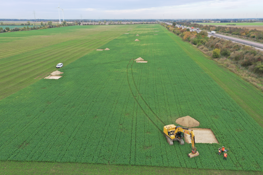 Flächennivellierungen wie für Industrieanlagen sind somit in aller Regel nicht notwendig, so dass bei zahlreichen archäologischen Bodenquellen und der kleinpunktuellen Tiefenverankerung der in Leichtbauweise errichteten Ständerbauweise keine flächendeckende archäologische Ausgrabung erforderlich wird. Vielmehr findet im ersten Schritt eine archäologische Magnetometerdokumentation mit situationsbezogenen Referenzschnitten statt (Abbildung 2). Ihre Ergebnisbewertung ist die Grundlage für die weiteren denkmalpflegerischen Abläufe. Dabei wird berücksichtigt, dass bildgebende Verfahren archäologische Strukturen aufzeigen können – aber nicht zwangsläufig müssen. Zahlreiche archäologische Denkmale zeichnen sich in den Messergebnissen nicht ab, obgleich ihre Erhaltung bereits wenige Zentimeter unterhalb der Geländeoberkante beginnt. Mit der Photovoltaik-Freiflächenanlage von Sangerhausen, Landkreis Mansfeld-Südharz, soll auf nur 4 Hektar eine Energiegewinnungsanlage entstehen. Das Messergebnis der geomagnetischen Untersuchung weist die betrachtete Mikroregion als Bestandteil einer jungsteinzeitlichen Sepukrallandschaft aus, die vermutlich in der anschließenden Epoche der Bronzezeit eine neue Interpretation erfuhr. Weitere Detailinformationen erbrachten die mit den Messungen unmittelbar verzahnten flächigen Bodenaufschlüsse.