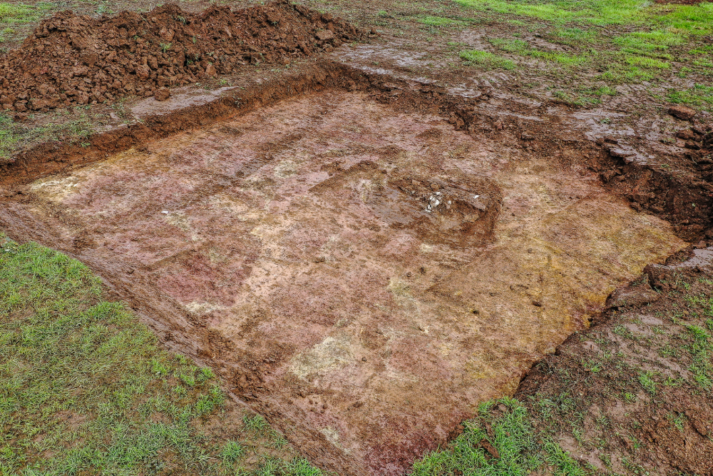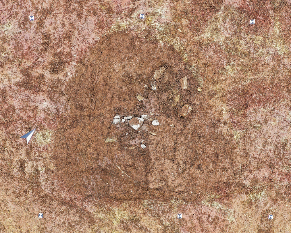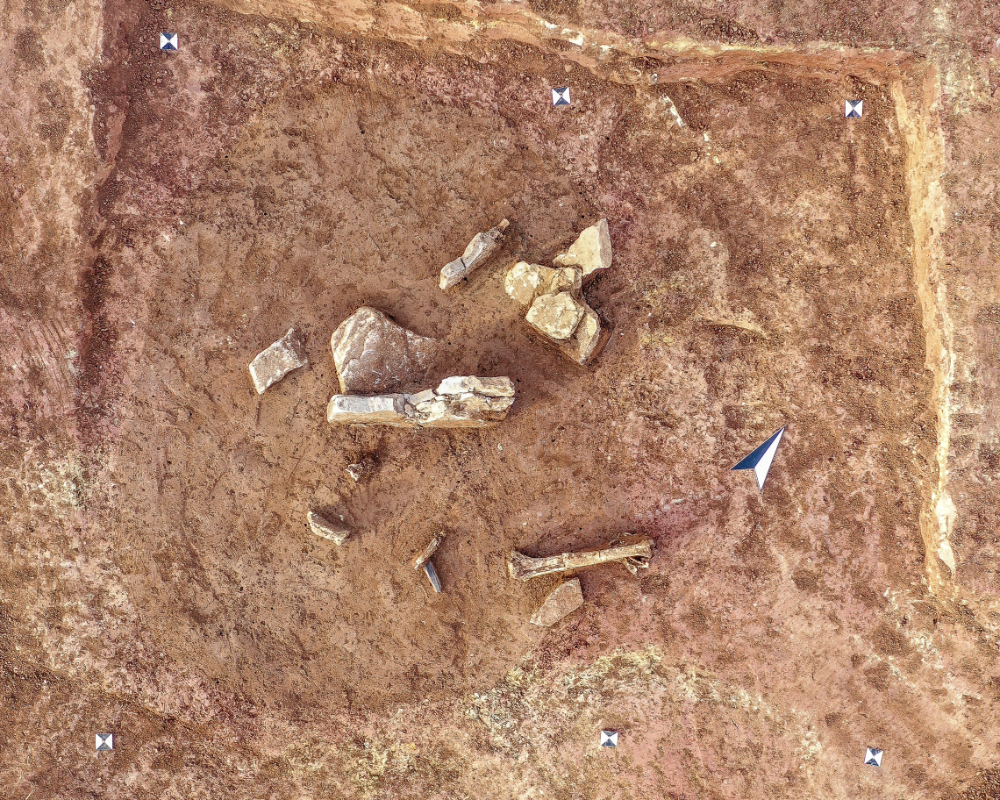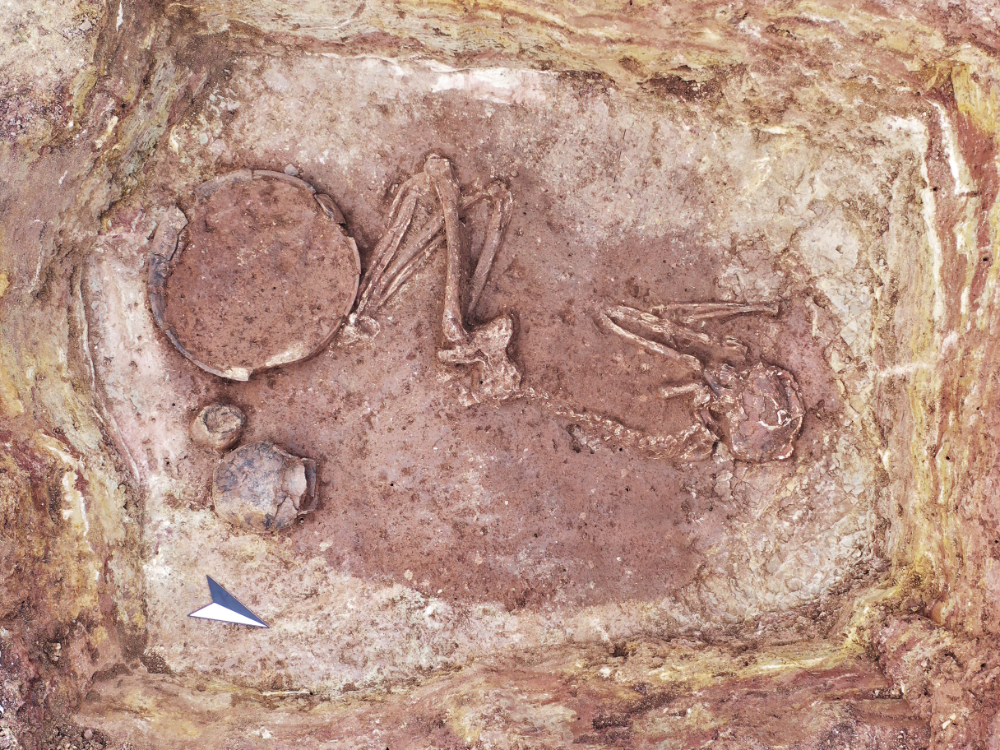 In einem der angelegten Referenzschnitte konnte eine außergewöhnliche Grablege mit drei Etagen erfasst werden. Sie lag am südöstlichen Hangfuß einer Kreisgrabenanlage von 16 Meter Durchmesser, deren Zugang nach Süden wies (Abbildung 3). Zeigte das Gräbchen der Kreisgrabenanlage noch eine Erhaltung von gerade einmal 12 Zentimeter Tiefe, war das oberste Grab (Grab I) im nebenliegenden Befund (Etagengrab) schon weitestgehend zerstört (Abbildung 4). Die Relikte eines Nord-Süd (Nordnordwest-Südsüdost) – ausgerichteten Steinkistengrabes waren noch 6 bis 8 Zentimeter erhalten. Einzelne Knochenfragmente belegen eine Körperbestattung in der Steinkiste. Grabbeigaben waren nicht (mehr?) vorhanden. Körperbestattungen in Steinkisten sind vor allem aus dem Neolithikum und der frühen Bronzezeit bekannt. Die Ausrichtung des Grabes legt eine Datierung in die Glockenbecher- oder Aunjetitzer Kultur nahe. Unmittelbar darunter befindet sich ein West-Ost ausgerichtete Bestattung (Grab II), wobei der östliche Abschnitt aufgrund seiner höheren Lage durch die Anlage des jüngeren Steinkistengrabes (Grab I) größtenteils zerstört wurde (Abbildung 5).