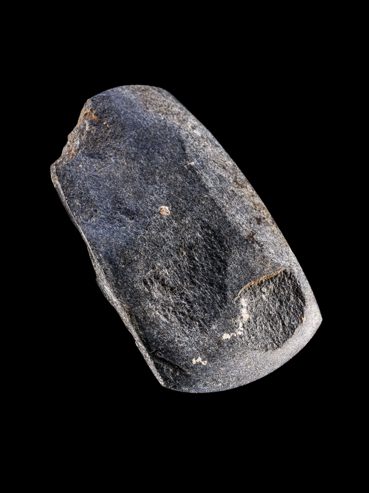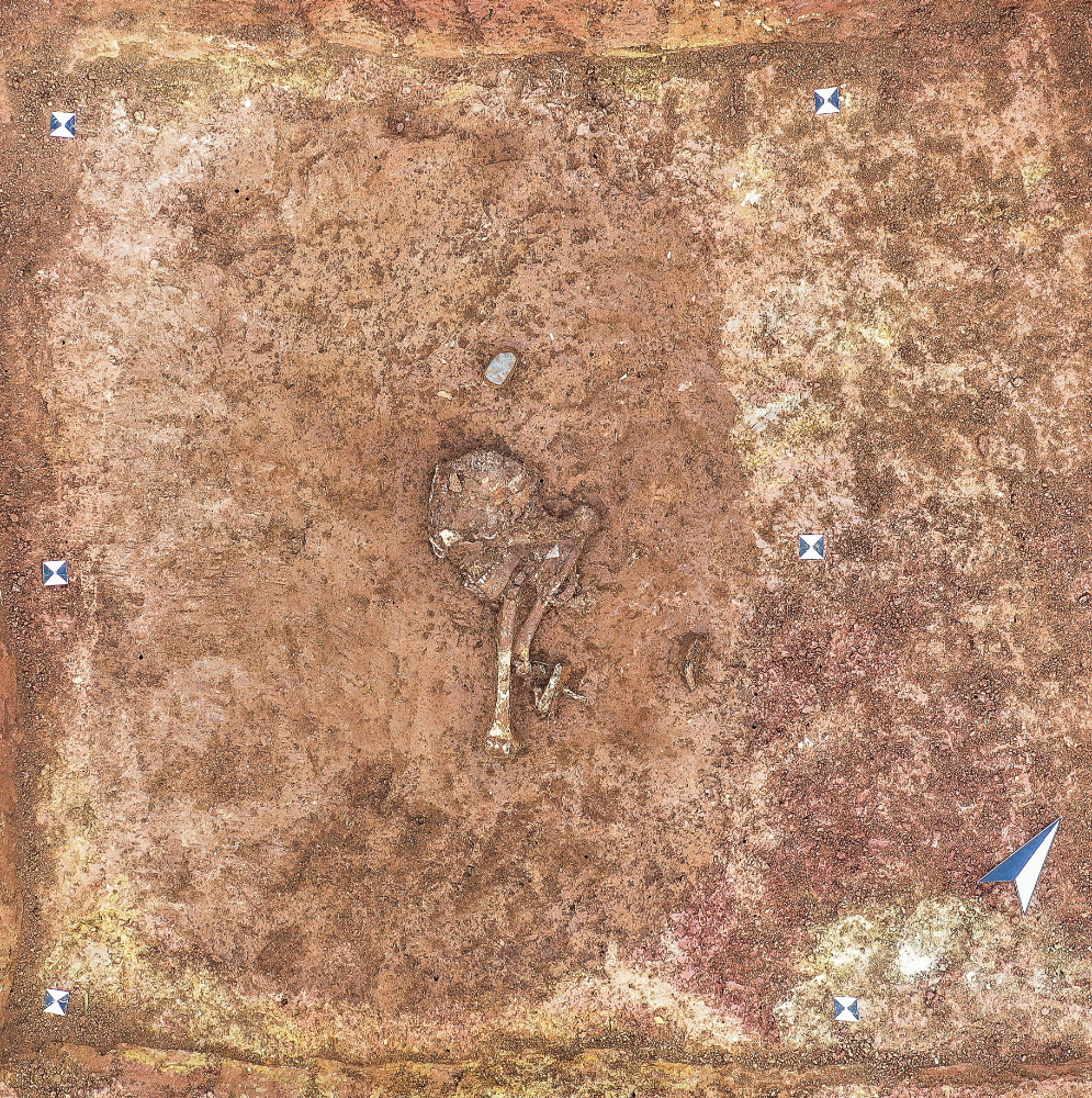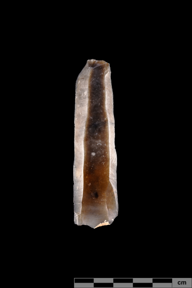 Im westlichen Bereich des Grabes reicht die Oberkante des Schädels mit 3 Zentimeter Abstand an die Unterkante der Steinkiste heran. Das Individuum lag mit dem Kopf im Westen der Grabgrube und blickte nach Süden. Aus dem im anatomischen Verband liegenden Knochen des Oberkörpers kann rekonstruiert werden, dass es sich um einen sogenannten „Rückenhocker“ gehandelt hat (Abbildung 6). Diese Haltung, mit dem Oberkörper in Rückenlage und nach einer Körperseite angehockten Beinen, ist in Mitteldeutschland speziell aus der Schnurkeramik (2800 bis 2050 vor Christus) und Glockenbecherkultur (2500 bis 2050 vor Christus) des Spätneolithikums bekannt. Der vorläufigen anthropologischen Begutachtung nach zu urteilen handelte es sich um einen erwachsenen Mann. Im Zusammenhang mit Orientierung und Lagekriterien ist eine Datierung in die schnurkeramische Kultur anzunehmen. Unterstützt wird diese durch die Beigaben: neben der im Beinbereich niedergelegten Silexklinge (Abbildung 7) lag hinter dem Kopf des Verstorbenen ein Steinbeil (Abbildung 8). Etagengräber, das heißt Bestattungen von zwei Personen übereinanderliegend, sind in Mitteldeutschland nicht häufig; sie entstanden regelhaft am Übergang der Stein- zur Bronzezeit, hier Glockenbecherkultur (2500 bis 2050 vor Christus) und Aunjetitzer Kultur (2300 bis 1550 vor Christus).
