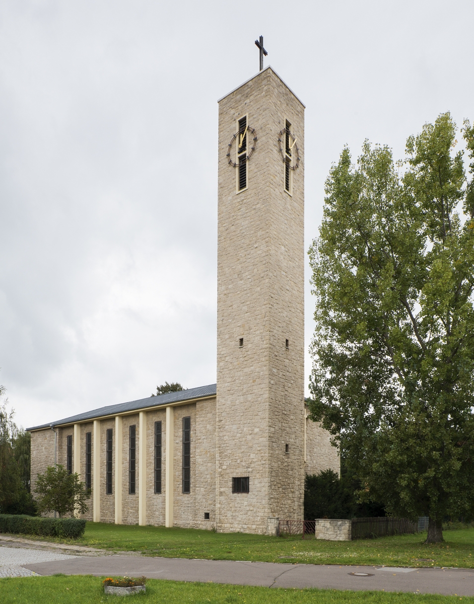 Die Kirche präsentiert sich in der umgebenden Gartenstadt als schlichter unverputzter Baukörper auf längsrechteckigem Grundriss mit sehr flachem Walmdach (Abbildung 1). Die kubischen Baumassen werden in ihrer Monumentalität durch das bossierte Natursteinmauerwerk in der Wirkung unterstrichen, gleichzeitig vereint die offene Präsentation der Betonpfeiler Tradition und Moderne. Die Fassade wird durch die Vertikale geprägt. Erreicht wird dies durch schlitzförmige Fenster und die entfernt an gotische Strebepfeiler erinnernden Außenstützen, die an die Fassade anschließen und das Raster für die dazwischen liegenden Fenster vorgeben. Ein schlanker, hoch aufragender und auf quadratischem Grundriss stehender Glockenturm befindet sich an der südöstlichen Ecke des Gebäudes. Der leicht gedrungen wirkende Haupteingang liegt im Westen und erstreckt sich – aus einer Doppeltür und zwei flankierenden Einzeltüren bestehend – über die gesamte Front. Auch hier wird die Fassade mittels Betonpfeiler gegliedert. Über dem Eingangsbereich befinden sich drei überlebensgroße steinerne Skulpturen auf Würfelpodesten, die Hildegard Wiegel geschaffen hat. Es handelt sich um Christus mit den Aposteln Petrus und Paulus. In der Mitte, über der Christus darstellenden Figur, ist ein Rundfenster mit profilierter steinerner Rahmung angebracht, das nach außen hin die Christusfigur betont und heraushebt, gleichzeitig aber auch zur Belichtung der Westempore im Inneren dient.