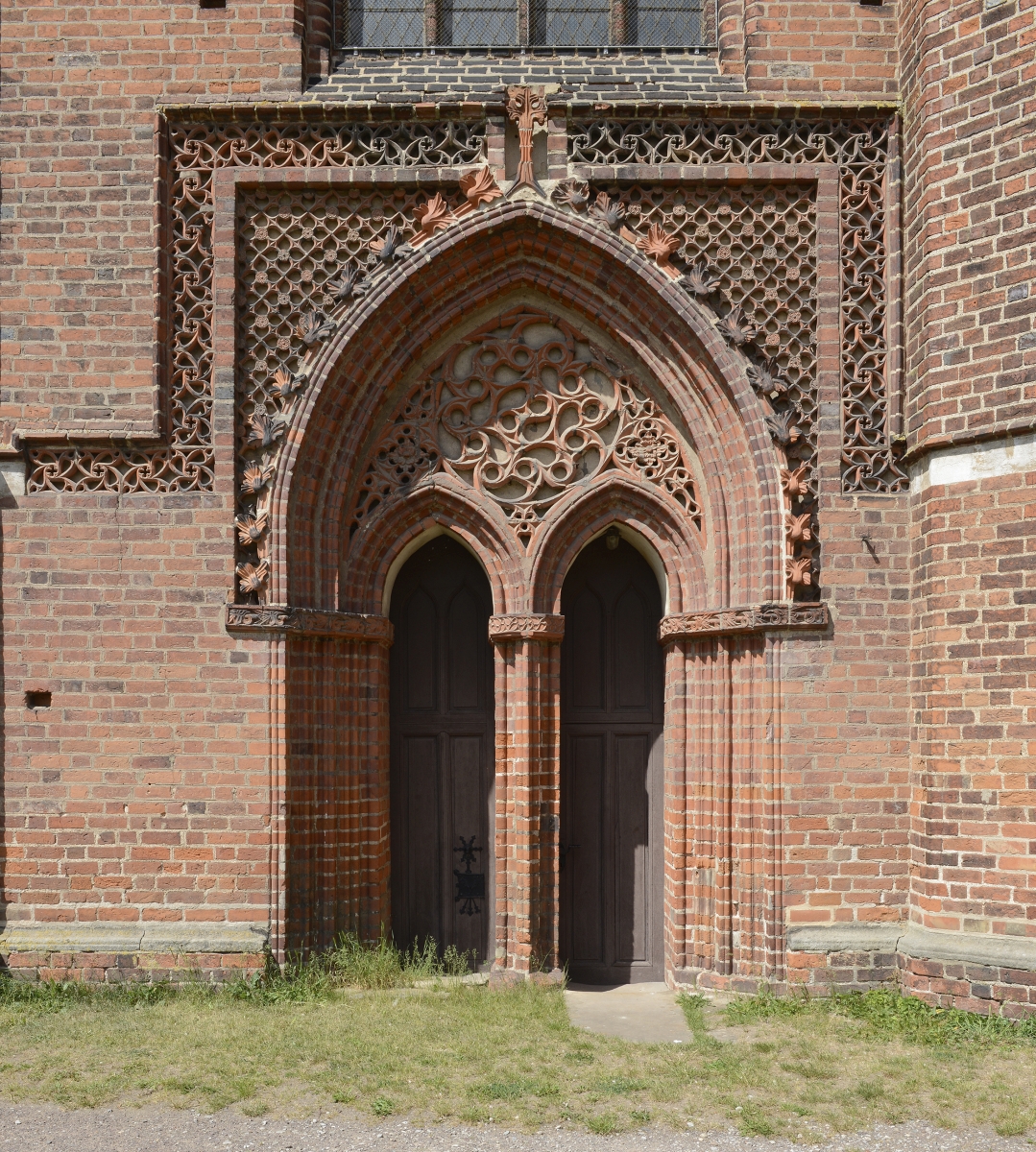 An dieser Hallenkirche mit dreischiffigem Langhaus (begonnen 1403/04), polygonalem Umgangschor mit Pseudoquerhaus (um 1450) und Westturmanlage mit der stadtbildprägenden barocken Nordturmhaube (1712, restauriert 1999/2000) ist alles aus Backstein gemauert, sogar das Maßwerk. Das abgebildete gotische Portal ist auf der Südseite der Kirche zu finden, wenn man von der Kirchstraße die Gasse rechterhand des Kirchturms zum platzartigen Pfarrhof auf dem Prälatenberg geht.