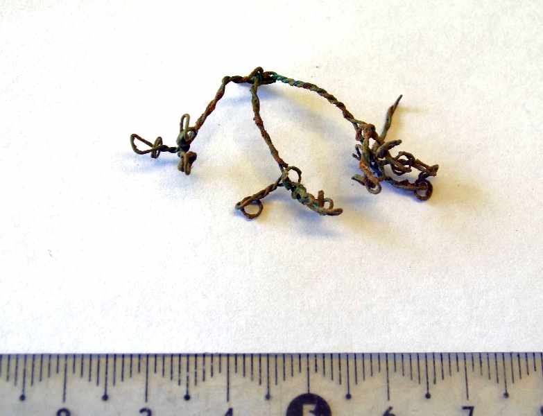 Die Untersuchung der Drahtreste in der Restaurierungswerkstatt ergab, dass in einem Grab zwei Drahtbäumchen und ein Nadelrest aus Buntmetall sowie Reste eines geflochtenen Lahnfadens erhalten waren. Der Lahnfaden bestand aus einer pflanzlichen Faser in S-Drehung, die in Z-Drehung mit flachem, versilbertem Kupferlahn umwickelt war. Die Drahtbäumchen setzten sich aus je drei Ästen zusammen, die wiederum aus je zwei gekordelten Drähten gebildet waren (Abbildung 3). An einem Ende waren die drei Äste zusammengedreht, an den Einzelenden war je ein Draht zu einer Schlaufe gebogen (Abbildung 4). Ursprünglich dienten diese sicherlich zur Befestigung einer Perle oder Ähnlichem (Abbildungen 3 und 4). Man wird davon ausgehen dürfen, dass hier die Reste einer sogenannten Totenkrone vorliegen.