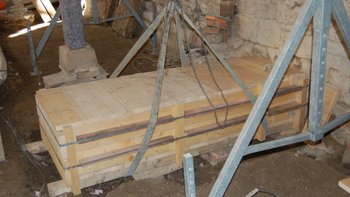Dabei deckten die Ausgräber neben zahlreichen Mörtelbruchstücken Fragmente mittelalterlicher Stuckplastik von bemerkenswerter künstlerischer Qualität auf. Besonders aufsehenerregend war ein über zwei Meter großer Block aus Stuck, der mit der gestalteten Seite nach unten lag. Nach Art einer Blockbergung gehoben und gewendet, zeigte das schätzungsweise 900 Kilogramm schwere Fundstück auf der Vorderseite das Relief einer Heiligenfigur.