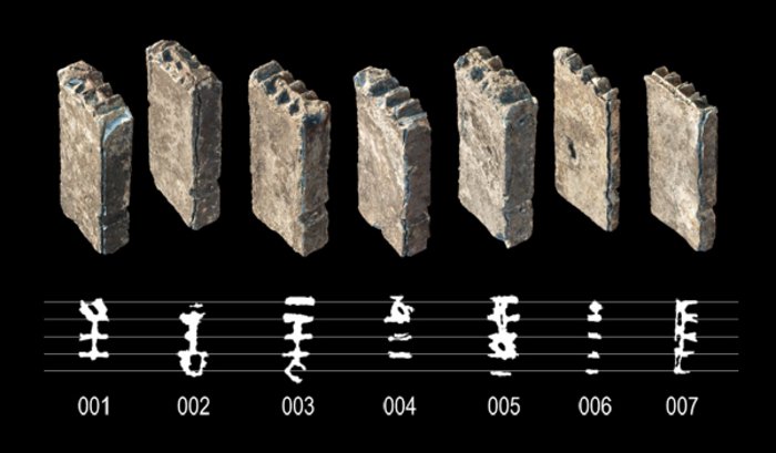 Sieben der insgesamt acht Notenlettern sind vollständig erhalten, die achte liegt nur fragmentarisch vor.