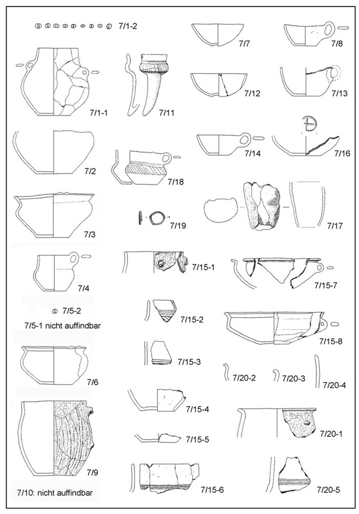 Bei den übrigen Gefäßen aus Grab 7 handelt es sich um meist unverzierte Terrinen unterschiedlichen Typs, Schalen, Schälchen mit und ohne Henkel, einer Tasse, einem Topf sowie mehreren Einzelscherben weiterer Gefäße. Bemerkenswert ist – auch durch Beigabenkombination mit dem Trinkhorn – die Beigabe von mehreren Tonperlen (Abbildung 3: 7/1, 2) sowie von einem Briquetage-Fragment (Abbildung 3: 7/17). Als Briquetage bezeichnet man in der Archäologie verschiedene Formen von technischer Keramik, die beim Salzsiedeprozess zum Einsatz kam. Briquetage kommt in den Gräbern der spätbronzezeitlichen Lausitzer Kultur ähnlich selten vor, wie tönerne Trinkhörner.
