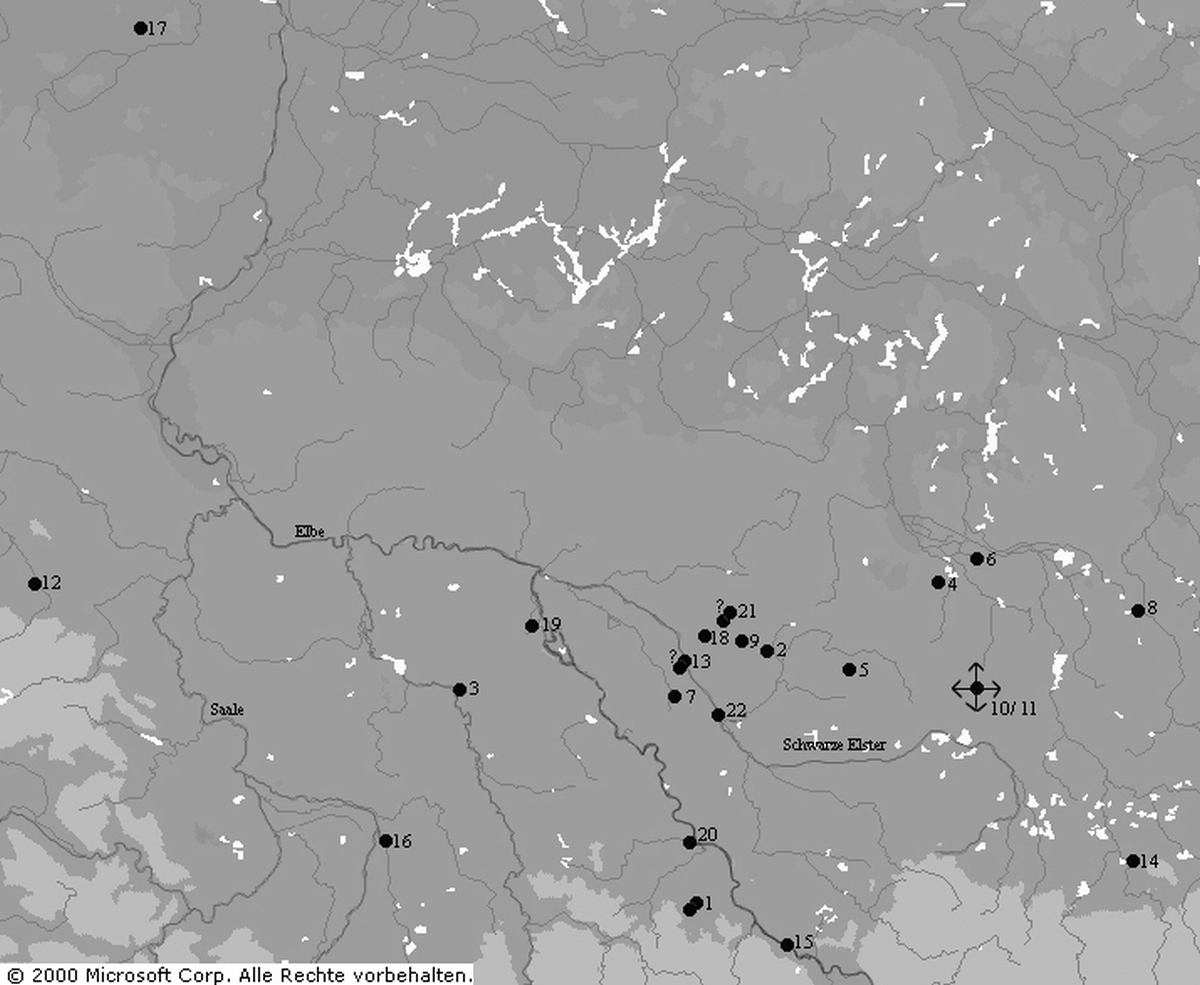 In späterer Zeit gelangten wohl auch einige Stücke in die Regionen westlich des Verbreitungsgebietes der Lausitzer Kultur, wie dies ein kleines Tontrinkhorn mit Standfuß aus Hoym, Landkreis Aschersleben-Staßfurt im Nordharzgebiet (Abbildung 5.12), belegt. Dieses wurde in einem Steinkistengrab mit Hausurne gefunden und datiert etwa Hallstatt B-C. Die meist verzierten Trinkhörner, die der Übergangszeit zwischen später Bronze- und beginnender Eisenzeit zugeordnet werden, stammen darüber hinaus aus Arenzhain, Landkreis Finsterwalde (Abbildung 5.2), Belten-Göritz, Landkreis Calau (Abbildung 5.4), Forst, Landkreis Spree-Neiße (Abbildung 5.8) und in isolierter Lage aus einem Gräberfeld in der Altmark von Lückstedt, Landkreis Stendal (Abbildung 5.17).