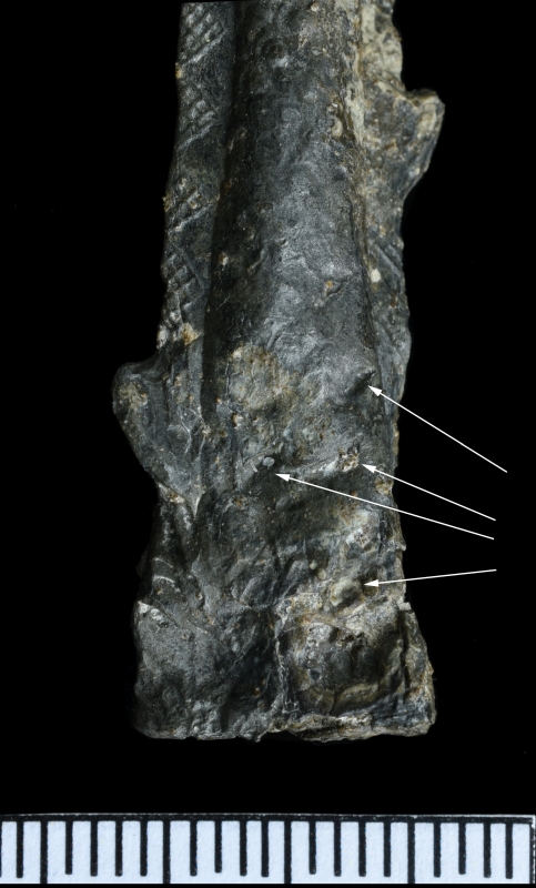 Das Fischmodell ist 6,6 Zentimeter groß und besteht aus einer Blei-Zinn-Legierung. Es sind sehr feine Details dargestellt: die Schuppen der Haut und feine Flossen mit dazwischen liegenden Rautenmustern (Abbildung 5). Im Gegensatz zu dieser genauen Ausarbeitung wurde der Kopf anscheinend nicht gestaltet. Der Fisch läuft am Kopfende rechteckig zu und ist 1,2 Zentimeter breit. An diesem Rand sind keine Bruchkanten vorhanden. Bei Untersuchungen unter dem Mikroskop wird erkennbar, dass es sich um eine hier zusammengebogene Tülle handelt (Abbildung 6). An den Tüllenwandungen befindet sich auf jeder Seite versetzt eine runde Vertiefung. Die Tülle wurde an dieser Stelle mechanisch verformt, um etwas einzuklemmen. Außerdem sind weitere Spuren vom Zusammenbiegen der Tülle erkennbar (Abbildung 7).