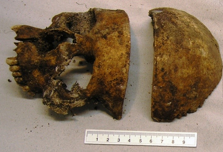 Im Zuge der Freilegung wurde eine Trepanationslinie an der Schädelstirn erkannt, welche darauf hinweist, dass am Leichnam des hier bestatteten circa 20 jährige Mann eine Obduktion durchgeführt wurde (Abbildung 4). In Westentaschenhöhe, also kurz über dem Becken zeigte sich ein kleines Stoffpaket mit einem grünen Schimmer. Aufgrund der starken Verunreinigung und auf Grund seiner länglichen ovalen Form wurde das Objekt zunächst als Brosche angesprochen. Der Sonderfund wurde nach Halle in die Restaurierungswerkstatt des Landesamtes für Denkmalpflege und Archäologie verbracht.