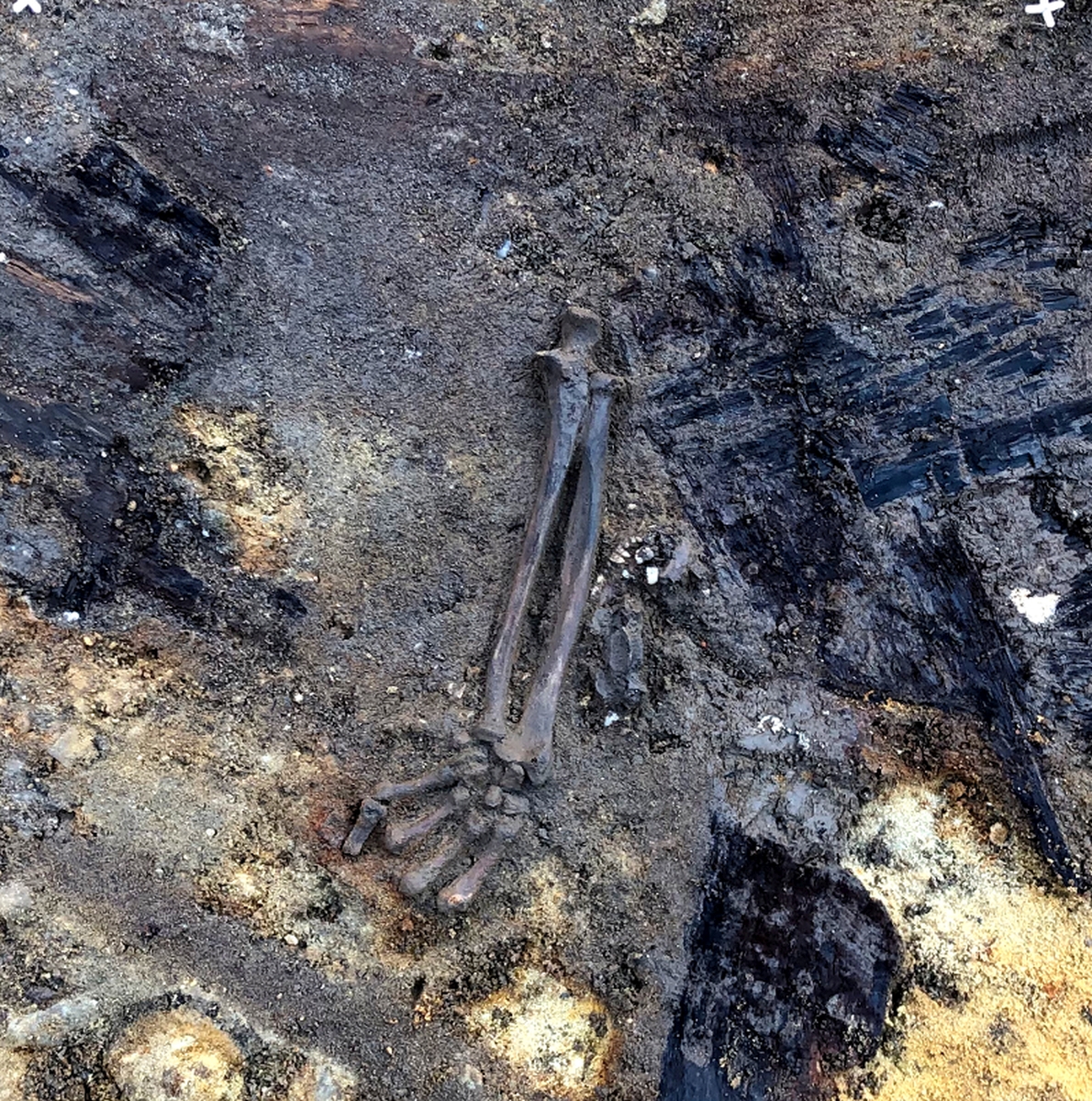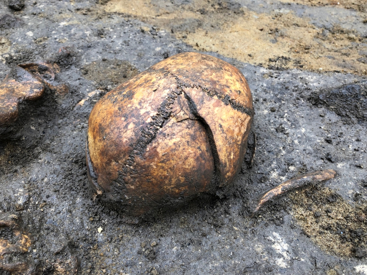 Eine weibliche Person lag bäuchlings Nord-Süd-ausgerichtet am Ostende der Gruft, wurde also lieblos hinein geworfen. In der Nähe eines erwachsenen Mannes, von dem aber lediglich die rechte Körperhälfte und die Wirbelsäule vorhanden waren, konnte eine deformierte Musketenkugel geborgen werden (Abbildung 5). Ob diese jedoch in Zusammenhang mit dem Toten steht, ist unklar. Eine Schussverletzung konnte bei der anschließenden Untersuchung der Knochen nämlich nicht festgestellt werden. Anders bei den Knochen, die sich darüber befanden. In einer circa 50 Zentimeter starken Aufschüttung lagen unzählige Knochen bunt vermengt, von denen einige Spuren stumpfer Gewalteinwirkung aufwiesen. So konnten an einem Schädel beispielsweise an drei Stellen schwere Hiebverletzungen nachgewiesen werden (Abbildung 6).