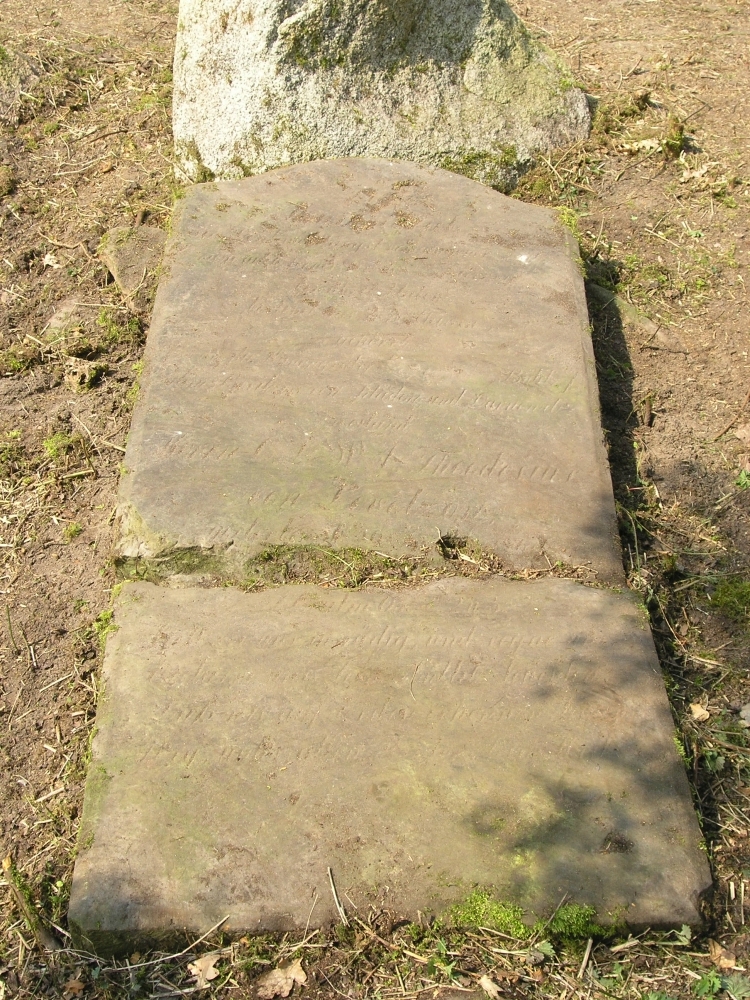 Für eine lange Zeit blieben dies die einzigen aus altmärkischen Großsteingräbern bekannten tiefstichkeramischen Scherben. Neben den Steinen der Umfassung liegt eine zerbrochene Sandsteinplatte (Abbildung 12). Dabei handelt es sich um eine Gedenktafel für den Domherren von Theodosius von Levetzow. Die heute nicht mehr lesbare Inschrift lautete: »Hünengrab – ein Denkmal längst vergangener Zeit – möge auch ferner vor der Zerstörung bewahrt bleiben – besteht aus 23 Steinen – gehöret [...] dem Besitzer von Kläden und Darnewitz – weiland Herrn C. L. W. A. Theodosius von Levetzow – gestorben den 29. Januar 1861 – Psalm 67, 2 und 3.«Die Inschriften lassen vermuten, dass die Sandsteintafeln in Bülitz und Kläden bereits zu Lebzeiten, nach Erwerb der Gräber,aufgestellt wurden und dass das Todesdatum als Nachtrag später hinzugefügt wurde.Nach einer mündlichen Information von Herrn Udo Schulze aus Bülitz im Jahre 2005 sollte die Klädener Tafel um 1950 für den Bau eines Ernst-Thälmann-Denkmals in Stendal verwendet werden. Als man sie vom Grab heben wollte, riss das Seil des Krans und die Platte zerbrach in zwei Teile, die man dann dort einfach liegen ließ, wo sie heute noch liegen. Zu den benachbarten Gräbern von Kläden und Steinfeld existieren einige Sagen, in denen sich streitende Riesen (Hünen) sowie ein Backofen (Großsteingrab) eine Rolle spielen.
