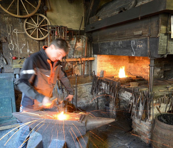 Das Herz der Schmiede, die Werkstatt, befindet sich im Unterstock und zeigt den fast unveränderten Bestand des 19./20. Jahrhunderts an Werkzeugen, Schmiedefeuer, Amboss und so weiter. Heute kann der Besucher Meister Wolf-Dieter Wittig nicht nur beim Schauschmieden »über die Schulter gucken«, sondern bei gesonderten Kursen auch selbst Hand an den Schmiedehammer legen (Abbildung 3).