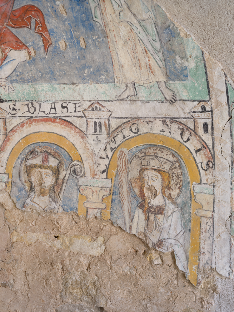 Die untere Zone der Apsisausmalung war durch eine umlaufende Rundbogenarchitektur (Abbildung 1) gegliedert. Den Platz in der linken der beiden erhaltenen Arkaden nimmt, mit Mitra und Stab gekennzeichnet, ein heiliger Bischof ein. Die Inschrift weist ihn als »S BLASI[US]« aus. Die Auswahl des heiligen Blasius könnte auf einen Einfluss aus Braunschweig hindeuten, wo dieser Heilige eine intensive Verehrung genoss. In der äußeren rechten Arkade ist eine gekrönte weibliche Heilige mit einem Palmzweig dargestellt, die sich nach links, also zur Apsismitte wendet. Die Heilige trägt ein rotes Gewand mit einer breiten Goldborte am Halsausschnitt sowie einen weißen Mantel. Das längliche Gesicht mit großen dunklen Augen und kräftig geröteten Wangen wird von langem blondem Haar eingefasst, das in einer Strähne bis auf die Brust fällt. Kinnbogen, Nase, Augenlider und Stirn erhalten durch ockerfarbene Schattenlinien Plastizität. Im Arkadenbogen gibt eine Inschrift ihren Namen »CVNIGVNDIS« an. Die 1033 verstorbene Herrscherin, Gemahlin des letzten ottonischen Kaisers Heinrich II., wurde im Jahr 1200 heiliggesprochen. Schon frühzeitig ist die Verehrung der heiligen Kunigunde im Harzumfeld nachweisbar. So sind im Hildesheimer Dom bereits 1206 Kunigundenreliquien vorhanden, und im Halberstädter Liebfrauenstift existierte schon vor 1212 ein Kunigundenaltar. Die Darstellung auf der Huysburg mit einem Palmzweig entspricht nicht der üblichen Ikonografie der Kaiserin mit Kirchenmodell oder Pflugschar und verwundert insofern, da Kunigunde nicht in die Reihe der klassischen Märtyrerinnen gehört. Der Palmzweig begegnet jedoch auch auf einer Miniatur im Elisabethpsalter, einer Handschrift aus dem Umfeld des Thüringer Landgrafenhofs vom Beginn des 13. Jahrhunderts (Museo Archeologico Nazionale; Soprintendenza per i Beni, A.P.P.S.A.E. del Friuli Venezia Giulia, Cod. CXXXVII, fol. 170r): Dort findet sich Kunigunde im Zusammenhang der Allerheiligenlitanei in Gemeinschaft von elf weiteren heiligen Frauen, die Palmzweige halten ohne ein Martyrium erlitten zu haben.