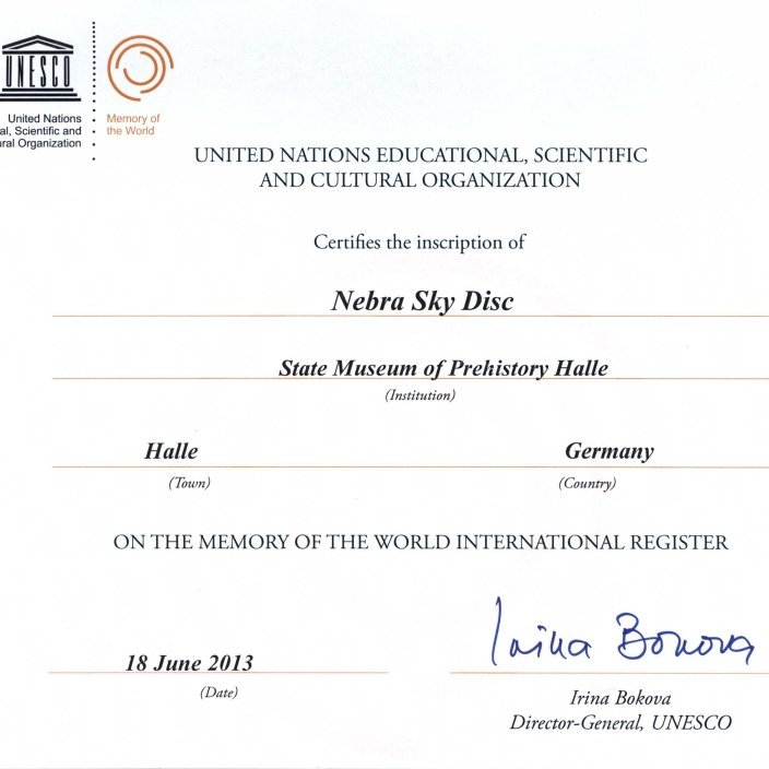 Mit der Himmelsscheibe von Nebra birgt die Sammlung des Landesmuseums für Vorgeschichte Halle (Saale) einen archäologischen Fund von Weltgeltung. Die mehr als 3.600 Jahre alte Bronzescheibe mit Goldapplikationen zeigt die älteste bekannte Darstellung kosmischer Phänomene. Aufgrund ihrer Bedeutung wurde sie am 18. Juni 2013 in das UNESCO-Dokumentenerbe ›Memory of the World‹ aufgenommen.